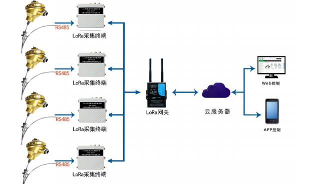 LORA网关通过“无线接收机”接收现场各个温度点的信号,现场每个温度点都有的编号与上位机软件一一对应。整个系统组网可以对大型场地进行6千多温度点的实时集中监测。