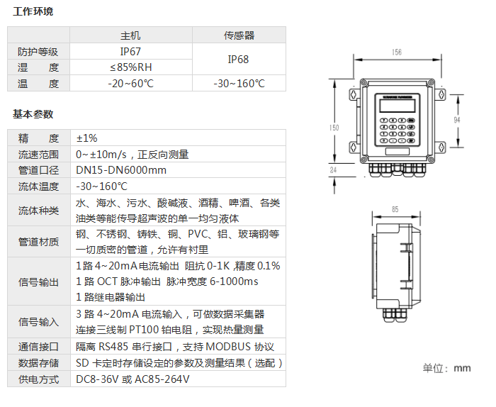 主机:85% RH;流量传感器:可浸水工作,水深≤2m(注:传感器灌胶后) |