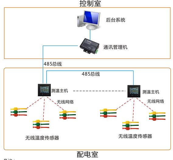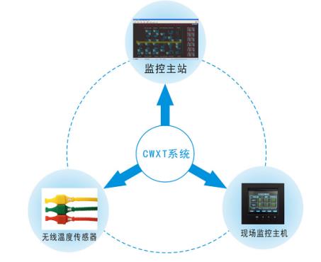现场监控主机带有无线通讯口,所测得温度数据可以通过无线的方式将温度数据上传至后台管理系统进行数据分析处理。无论被监测设备那一点温度异常,后台系统都能准确的发出报警信号,真正实现了开关室无人值守。