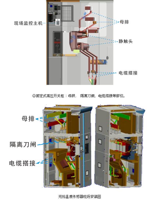 1、无线温度传感安装于开关柜内电缆头、断路器触头等电气连接处等部位。