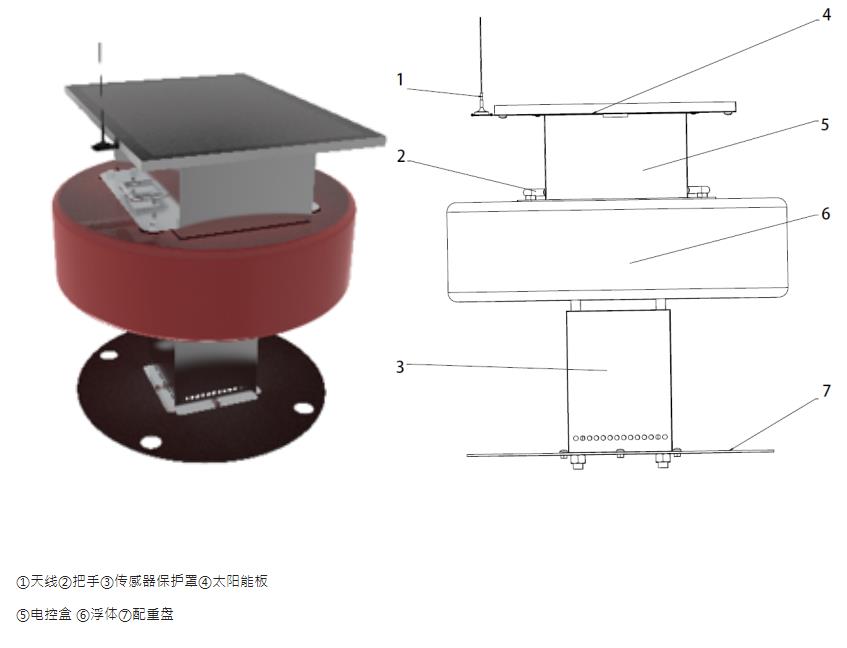 小型浮标水质监测站主要由浮标体、安装支架、电子器件舱、控制和数据发送模块组成。