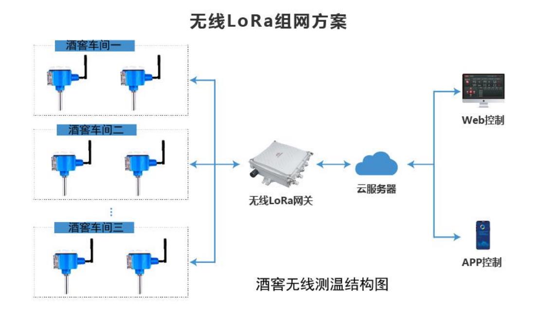 公司研发的LORA型窖温在线监测系统由窖温探测器、无线网关和远程管理系统组成。 系统采用LORA无线通讯技术,避免地窖使用时现场大量布线,降低地窖温度。 监控的经济成本。