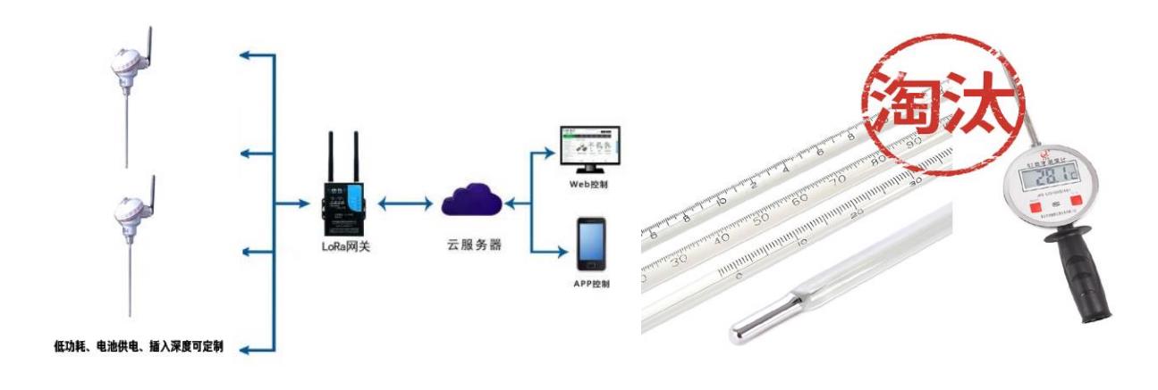 用于酒窖温度检测的设备是LORA插入式温度计:该设备由一定高度的探杆和数显头组成。 使用时,将探杆垂直插入地窖内。 通过探杆内的测温点对窖温进行多点、多层温度检测,温度信息实时显示在液晶屏上,并通过LORA信号上传至无线网关,然后通过网关上传至远程监控中心。