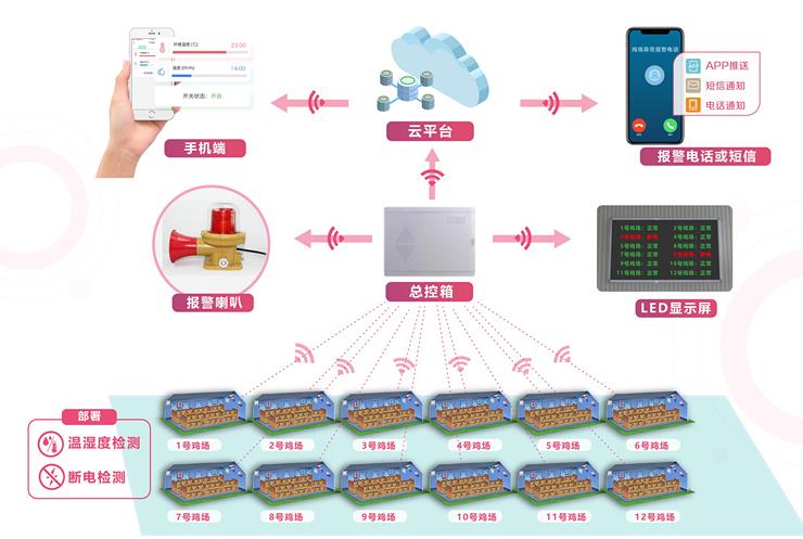 在每个鸡舍内安装一套智能在线断电报警器和智能在线温湿度检测器,当出现断电,缺相或者高温情况,鸡舍本地的光报警器会发出光报警。鸡舍智能设备是采用lora无线传输的,所有鸡舍可以实时把数据无线传输到总控箱的lora网关。