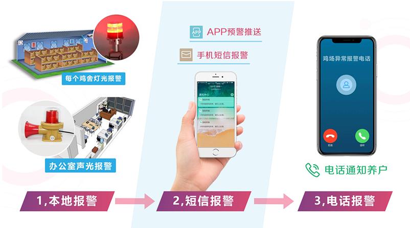 云平台收到所有鸡舍数据后,APP可以实时看到所有数据,可以在PC管理系统查找所有数据记录,导出分析。当收到报警信息时候,平台会分级自动处理,根据安全报警级别,分别选择拨打报警电话通知用户,发送报警短信告知用户,APP会主动推送预警信息。
