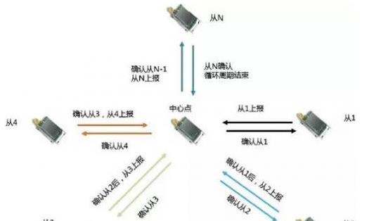 一点对多点通信,N个从节点轮流与中心点通信,从节点上传,等待中心点收到后返回确认,然后下一个节点再开始上传,直到所有N个节点全部完成,一个循环周期结束,如图2所示。该结构本质上还属于点对点通信,但是加入了分时处理,N个从节点之间的频点可以分开,也可重复使用。优势在于单项目成本低,不足之处是仅适合从节点数量不大和网络实时性要求不高的应用。