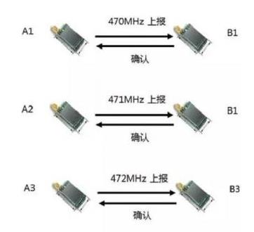一点对一点通信,多见于早期的LoRa技术,A点发起,B点接收,可以回复也可以不回复确认,多组之间的频点建议分开,如图1所示。单纯利用LoRa调制灵敏度高的特性,目前主要针对特定应用和试验性质的项目。优点在于最简单,缺点在于不存在组网。