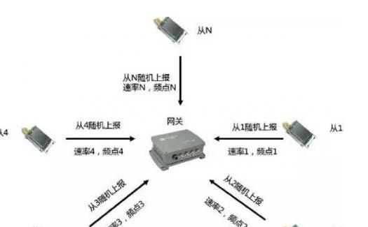 如图3所示,一点对多点通信,多个从节点可同时与中心点通信,从节点可随机上报数据,节点可以根据外界环境和信道阻塞自动采取跳频和速率自适应技术,逻辑上网关可以接收不同速率和不同频点的信号组合,物理上网关可以同时接收8路、16路、32路甚至更多路数据,减少了大量节点上行时冲突的概率。该系统具有极大的延拓性,可单独建网,可交叉组网,LoRa领域内目前主要指的是LoRaWAN技术。