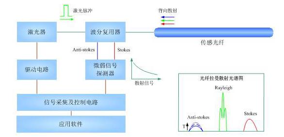 光纤既是传输介质,又是传感器。高速驱动电路驱动激光器发出一窄脉宽激光脉冲,激光脉冲经波分复用器后沿传感光纤向前传输,激光脉冲与光纤分子相互作用,产生多种微弱的背向散射,包括瑞利(Rayleigh)散射、布里渊(Brillouin)散射和拉曼(Raman)散射等,其中拉曼散射是由于光纤分子的热振动,产生温度不敏感的斯托克斯(Stokes)光和温度敏感的反斯托克斯(Anti-Stokes)光,两者的波长不一样,经波分复用器分离后由高灵敏的探测器所探测。光纤中的Anti-Stokes光强受外界温度调制,Anti-Stokes与Stokes的光强比值准确反映了温度信息;不同位置的拉曼散射信号返回探测器的时间是不一样的,通过测量该回波时间即可确定散射信号所对应的光纤位置;结合高速信号采集与数据处理技术,可准确、快速地获得整根传感光纤上任一点的温度分布信息。