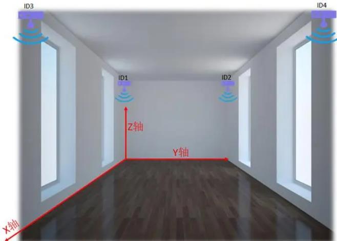 如下图所示,在室内空间内安装上一定数量定位基站,需要被定位的目标对象携带定位标签,定位基站在室内的位置是已知的固定不变的,标签的位置是未知的变动的,通过标签和基站的通信,就可以通过解方程的形式由已知的坐标解算出未知的坐标了。