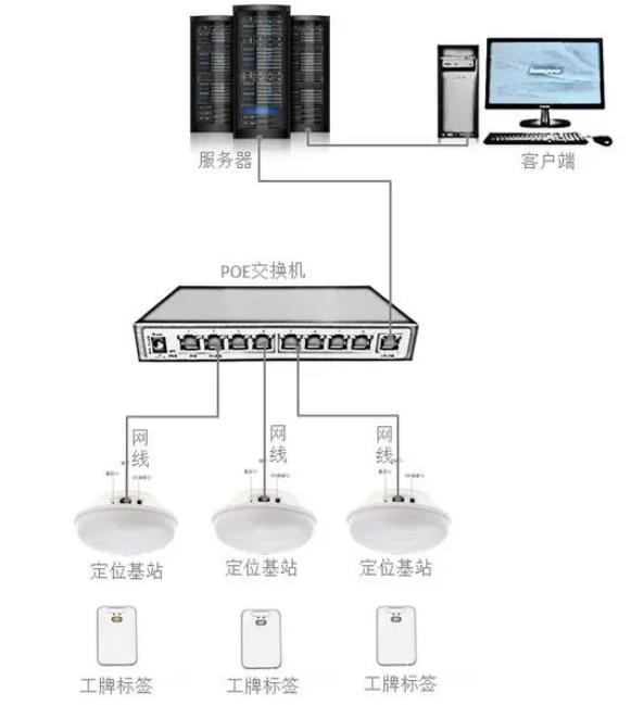 如下图所示,养老院人员定位系统主要由:1、人员佩戴的定位工牌或者定位手环;2、定位基站;3、通信系统(网线和交换机);4、服务器和用户端电脑;5、定位系统软件组成。