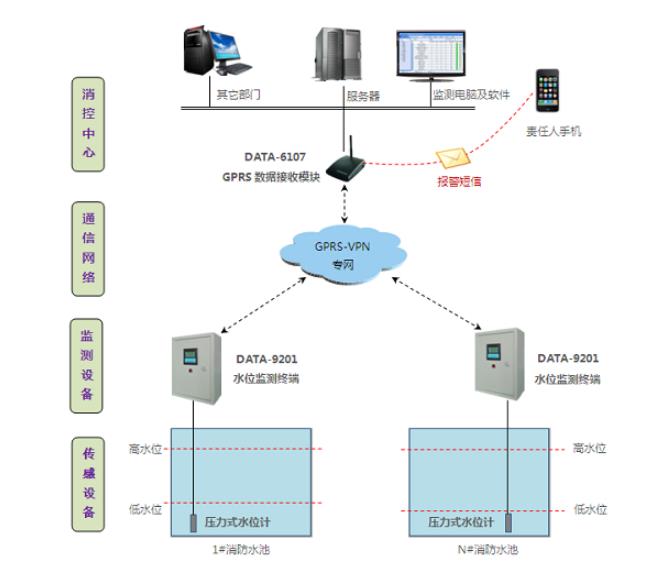 水位下降甚至无水情况难以及时发现,导致火灾发生时无水可用,将延误救火最佳时机。这种情况在全国各地普遍存在,如何消除消防水箱/水池安全隐患,成为亟待解决的消防难题之一。为确保消防安全、时刻保障消防用水,对所有消防水池进行远程监测,以实时掌握水池水位,及时向水池补水;消防水池水位远程监控系统应用而生。消防水池与消防控制中心之间距离较远、不便布线,因此采用了无线水位传感器解决方案GPRS-VPN的无线组网方式。