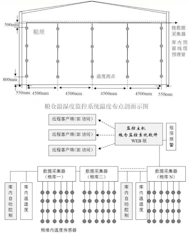 现场控制监测点的数量由粮仓的面积和数量决定。主要由数字温湿度变送器、数据采集仪、通讯转换器、通讯线缆、配电控制柜及安装附件组成。所有监测点的温湿度测量值最终转换为数字信号,被传送到上位管理主机。通过配套的数据管理软件对数据进行分析、处理、存储、打印等。