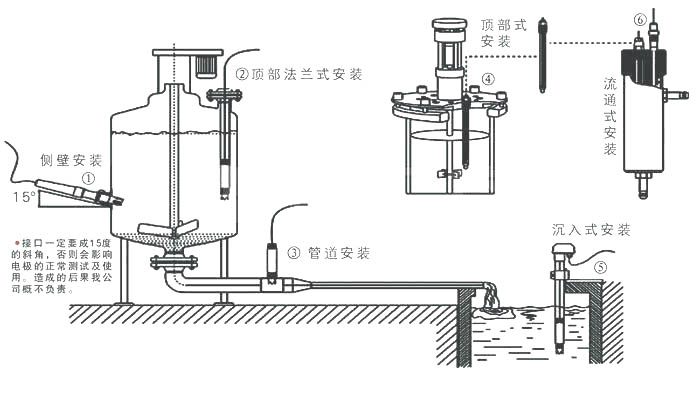 2、常见的ph检测仪几种安装方式为保证电极在管路上正确测量出PH值,应避免测量池间出现气泡而造成数据失准,请严格按照下图安装。1.电极应安装在主管道旁的旁路中,前端应安装阀门,控制流速,流量应尽量小,一般只要出水口有稳定的水溶液滴出即可。电极应垂直安装并且深入到活动水体中,出水口应比进水口高以保证电极完全浸在溶液中。2.电极安装前应进行标定。3.测量信号属微弱电信号,其采集电缆应独立走线,禁止和动力线、控制线连接在同一组电缆接头或端子板中,以免干扰或击穿测量单位。