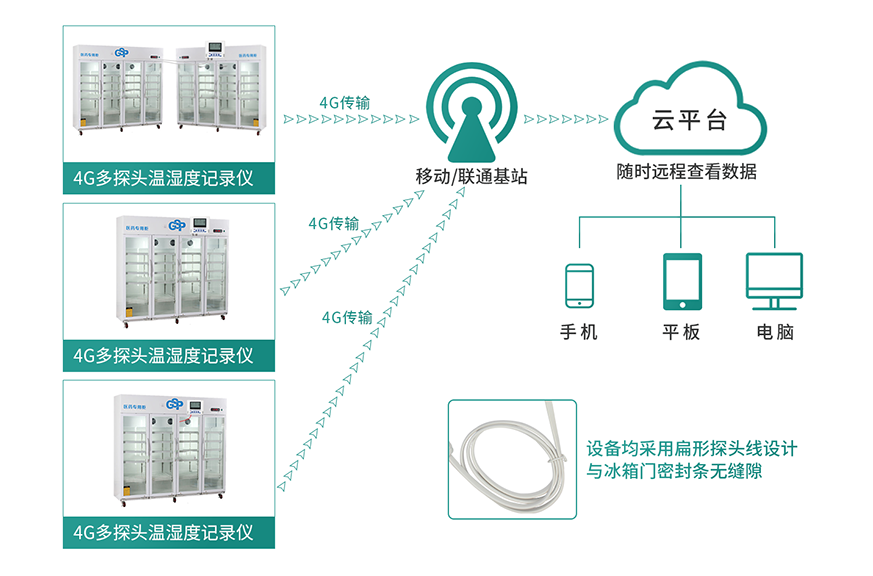 在没有无线网和LORA的环境中,可以采用4G传输的方式,这种环境中的监测系统主要是由4G多探头温湿度记录仪/4G单探头温湿度记录仪/4G超低温湿度记录仪和环境监控云平台两部分组成。