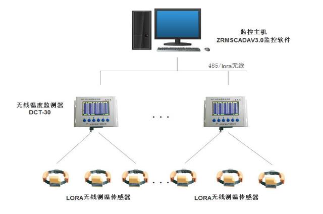 LORA无线测温系统主要由四部分组成:LORA无线温度传感器、无线温度监测器、监控主机、监控软件。其中无线温度传感器和无线温度监测器是系统的终端设备,监控主机和监控软件是整个系统的核心,负责整个系统的管理、数据记录与处理,并提供多客户端的查询功能。
