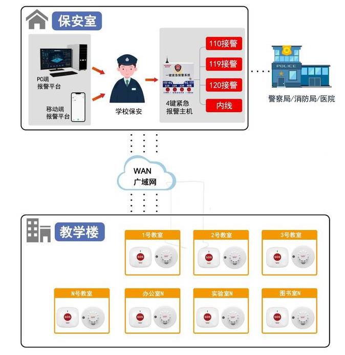 为此公司结合最新的物联网技术,在传统的防盗报警系统的基础上推出了更加方便可靠的智慧校园一键报警解决方案。