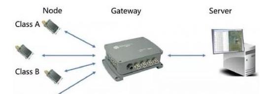 节点/终端(Node):LoRa节点,代表了海量的各类传感应用,在LoRaWAN协议里被分为Class A、Class B和Class C三类不同的工作模式。Class A工作模式下节点主动上报,平时休眠,只有在固定的窗口期才能接收网关下行数据。Class A的优势是功耗极低,比非LoRaWAN的LoRa节点功耗更低,比如针对水表应用的10年以上工作寿命通常就是基于Class A实现的。ClassB模式是固定周期时间同步,在固定周期内可以随机确定窗口期接收网关下行数据,兼顾实时性和低功耗,特点是对时间同步要求很高。Class C模式是常发常收模式,节点不考虑功耗,随时可以接收网关下行数据,实时性最好,适合不考虑功耗或需要大量下行数据控制的应用,比如智能电表或智能路灯控制。